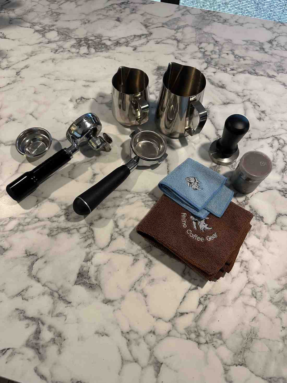 Machine is lovely and shiny with expected use marks but not much. I do also have the original box and it comes with all the accessories in the images - 2 portafilters (the 2 way one that came with it originally isn't the best), 2 x milk jugs, chocolate sprinkler, cloths, tamper and additional basket.
